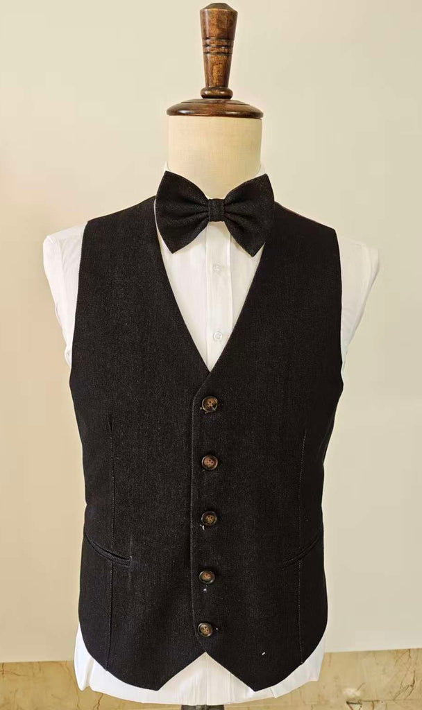 这款黑色牛仔三件套西装兼具正式感与休闲感。采用深黑色牛仔面料,既散发着自然随性的气息,又保持了高级西装的利落廓形和流畅线条。无论是周末聚会、商务休闲场合,还是仅仅想让自己的风格脱颖而出,这套西装都能完美驾驭——无需费心搭配。 夹克的贴袋、柔和的自然肩线和牛仔布纹理营造出休闲随性的感觉,而马甲和长裤则保持了整体造型的利落和平衡。手工缝制的彩色纽扣孔和对比色缝线为整个设计增添了一抹低调的个性。 这套黑色牛仔三件套西装并不追求过于正式,而是旨在让你保持舒适、自信和时尚——一种休闲却又不失精致的风格。