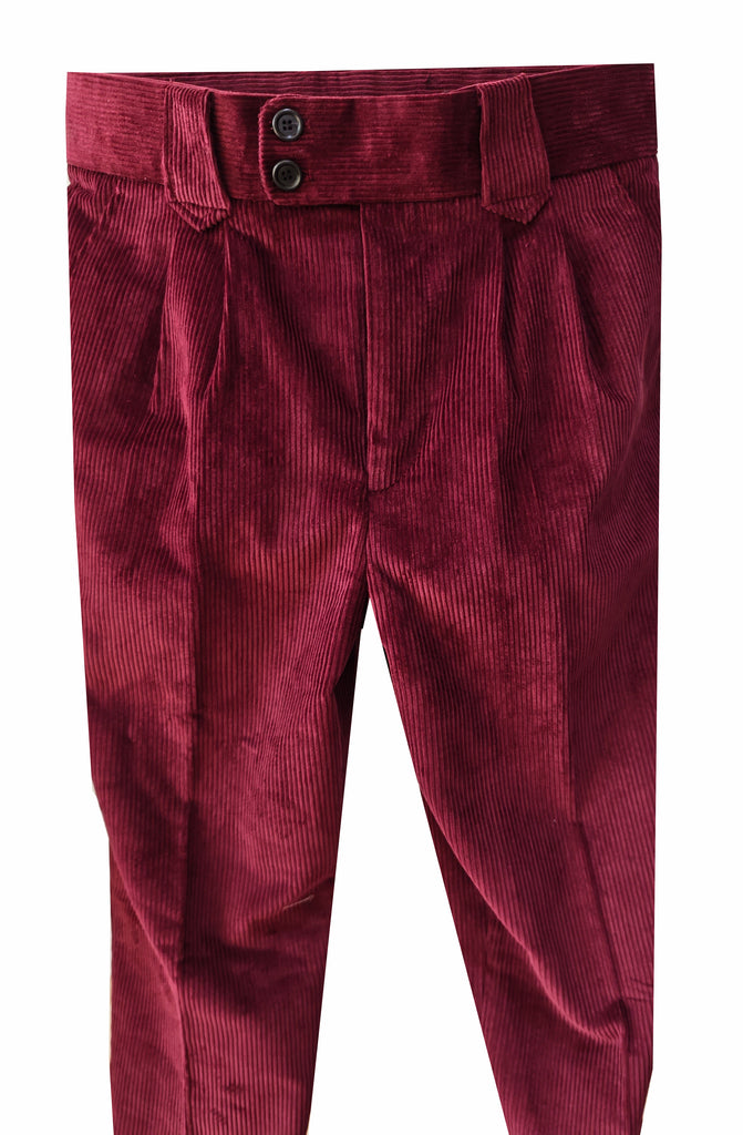 这款酒红色灯芯绒三件套西装以其独特的质感和鲜明的个性脱颖而出,专为追求时尚与个性的绅士而设计。灯芯绒面料拥有清晰的垂直纹理和挺括的手感,营造出层次丰富的视觉效果,为任何冬季装扮增添气场。外套采用经典的双扣设计,线条简洁利落,贴袋则在保持精致廓形的同时,增添了一丝复古休闲的气息。胸袋上点缀着一块色彩鲜艳的口袋巾,更添一抹精致优雅。同色系的灯芯绒马甲与西装外套完美搭配,尽显优雅气质,而酒红色领结则提升了整体的正式感——是婚礼、派对和冬季正式场合的理想之选。深邃的酒红色调既富有表现力又不失精致,在光线下更显层次丰富。这款灯芯绒三件套西装完美融合了品味与个性,确保您在任何重要场合都光彩夺目。