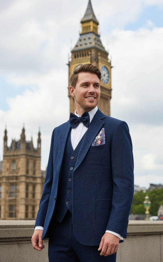 这套深蓝色牛仔三件套西装,瞬间就能营造出一种“休闲又不失精致”的氛围。它保留了西装简洁利落的廓形,而牛仔面料则赋予其自然随性的气息,完美平衡了优雅与休闲。深蓝色牛仔面料百搭易配,是日常穿着的理想之选。贴袋设计、柔和的肩部线条以及轻盈的面料,让外套穿着舒适自在,更像是一件精致优雅的休闲外套。马甲和西裤保持了利落的版型,确保整体造型的精致感。手工缝制的彩色纽扣孔和对比色缝线,在不张扬的前提下,增添了个性魅力,恰到好处的点缀,让整套西装显得独特而有品位。无论是周末的咖啡小酌、商务休闲场合,还是轻松的聚会,这套深蓝色牛仔三件套西装都能轻松融入您的日常生活。它的魅力在于自信、时尚和舒适——既不会过于正式,也不会过于隆重,一切都恰到好处。