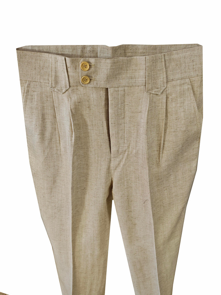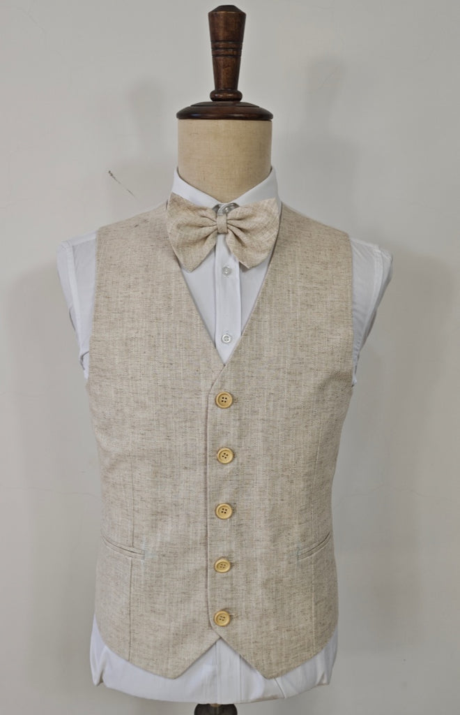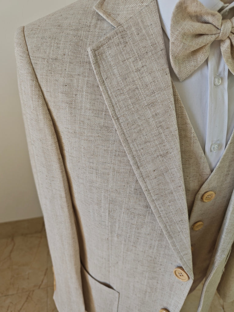 米色人字纹棉麻三件套西装——休闲风格 这款米色人字纹棉麻三件套西装的设计灵感源自意大利南部永恒的优雅,采用经典的休闲风格。轻盈的棉麻混纺面料透气柔软,垂坠感自然舒适,是温暖天气下的理想之选。米色调搭配精致的人字纹纹理,营造出阳光般明媚的氛围,既休闲又不失格调。
