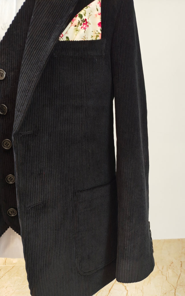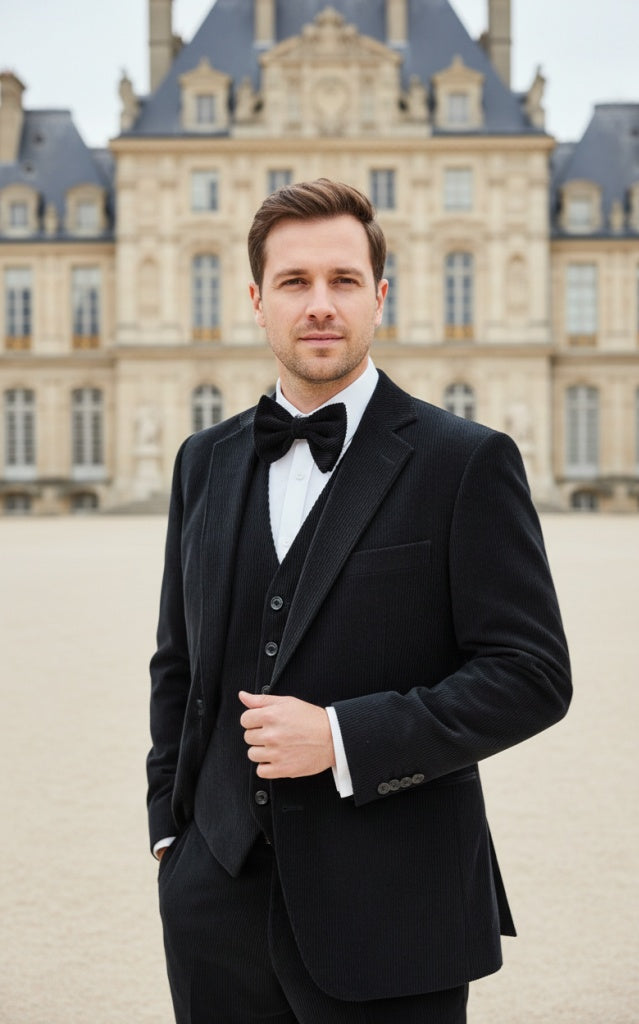 这款黑色灯芯绒三件套西装将精致的质感与自信的气质完美融合,打造出永不过时的经典造型。西装采用挺括的灯芯绒面料,线条清晰利落,尽显深邃质感和独特个性,散发着大胆而低调的优雅,是寒冷季节的理想之选。外套采用经典的双扣设计,线条流畅利落,贴袋设计增添了一丝复古韵味,同时又不失精致的廓形。同款灯芯绒马甲与西装相得益彰,无论整套穿着还是单独搭配,都能呈现出和谐统一的高级感。搭配黑色领结,更添一份庄重典雅的气质,是婚礼、冬季活动、正式聚会或晚宴等场合的完美之选。深邃的黑色调如天鹅绒般柔滑,巧妙地衬托出灯芯绒的质感,低调而不失优雅。对于那些追求现代自信、经典剪裁和独特个性的人士而言,这套西装无疑是理想之选。大胆、挺括、时尚感十足——这款黑色灯芯绒三件套西装确保您无论走到哪里都能给人留下深刻印象。