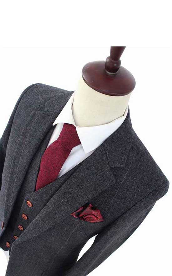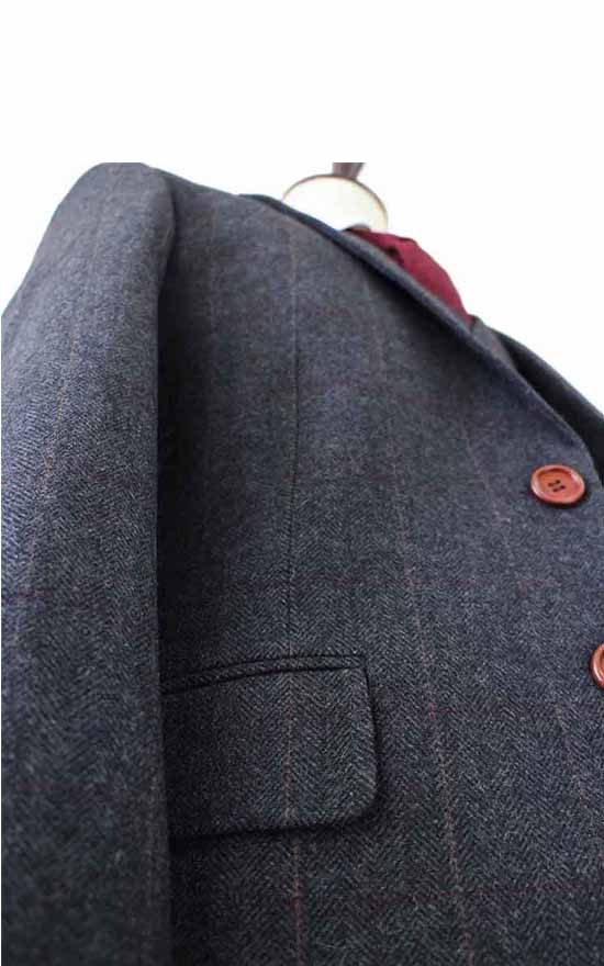 这款品质极佳的黑色人字纹粗花呢西装,搭配酒红色窗格纹图案,更显精致。