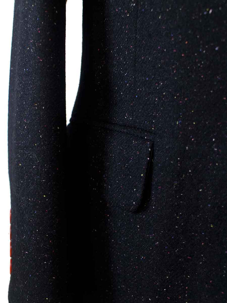 • 双开衩后背和缺角翻领上的纽扣孔细节