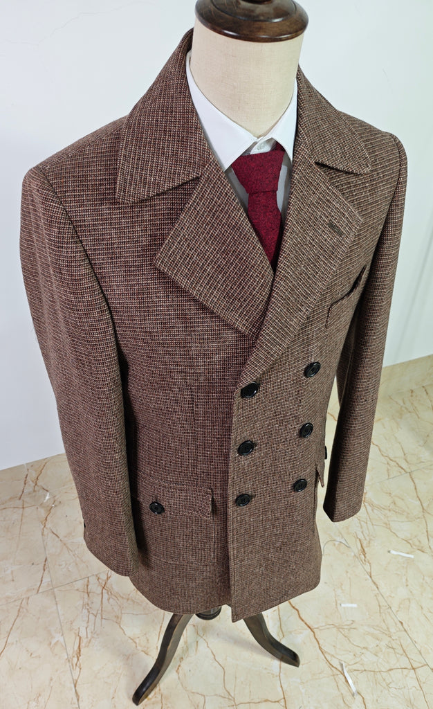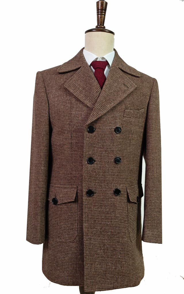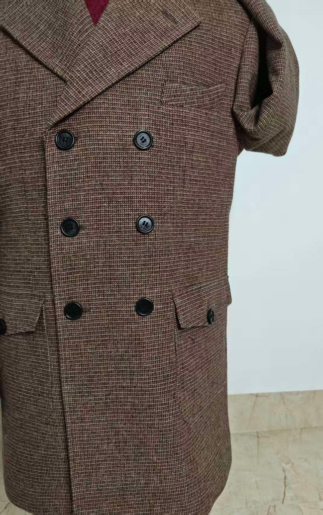 这款棕色双排扣宽翻领大衣,尽显男士服饰的永恒优雅,专为追求经典英伦设计的现代绅士量身打造。大衣采用优质羊毛混纺面料,廓形挺括,宽大的尖领和六粒扣双排扣设计更添精致感。低调的格纹图案增添了质感和优雅气质,而全衬里则确保了在寒冷季节的温暖舒适。无论是搭配剪裁合身的西装,还是休闲正装,都能完美打造精致的冬季造型。