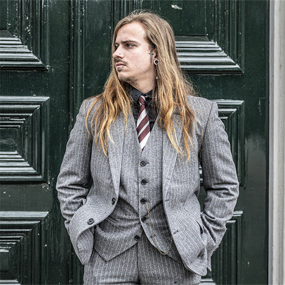 这款灰色细条纹粗花呢三件套西装,让您在人群中脱颖而出。这款奢华服装适合商务或休闲场合,是任何婚礼派对的完美选择。