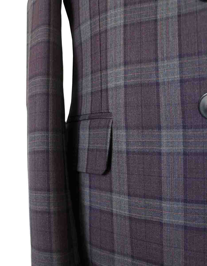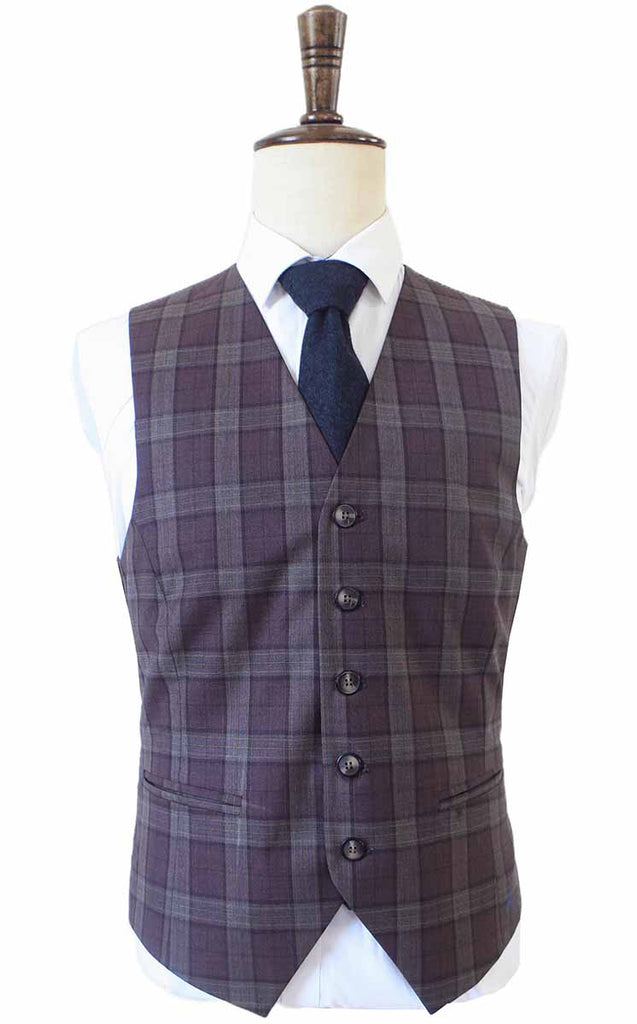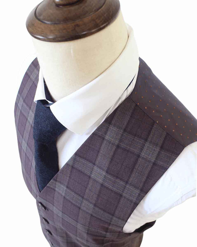 与西装外套完美搭配的是一件同色系马甲,共同构成了这套三件套西装。马甲增添了一份精致优雅和百搭感,可根据不同场合打造多种造型。其酒红色格纹设计与西装浑然一体,营造出和谐精致的视觉效果。